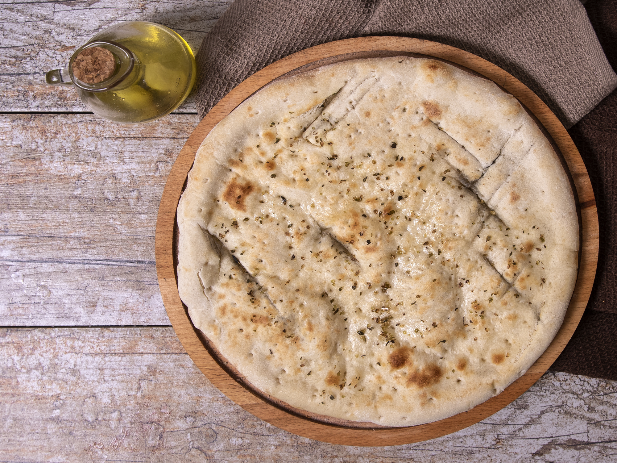 Focaccia, mozzarella, rosii, usturoi, busuioc, oregano, ulei de masline